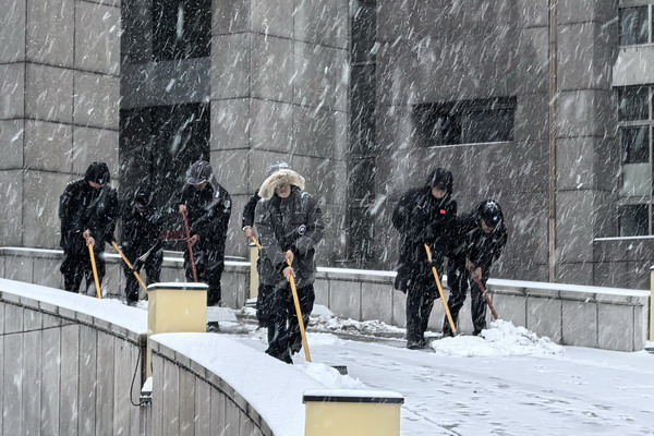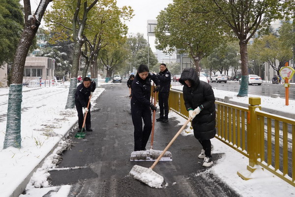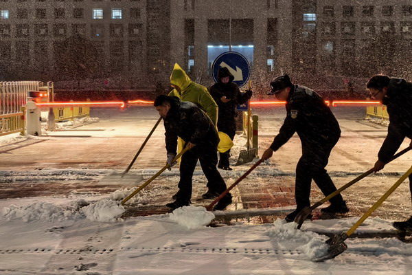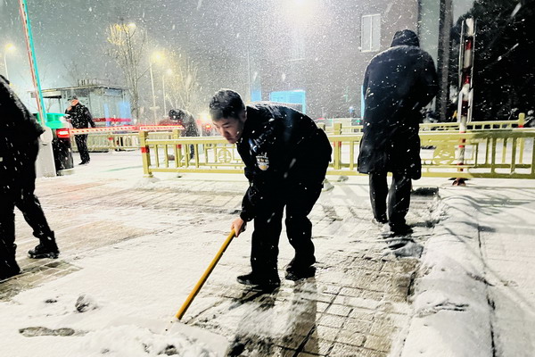 清扫单位周边道路积雪,用藏蓝身影为出行群众铺就一条条平安之路。