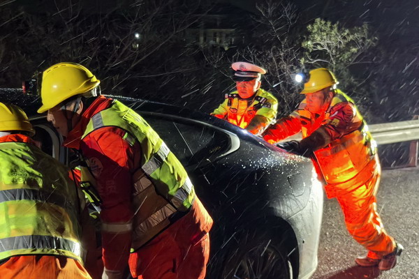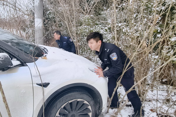 在雪中救助车辆故障的群众,传递寒冬中的温暖。