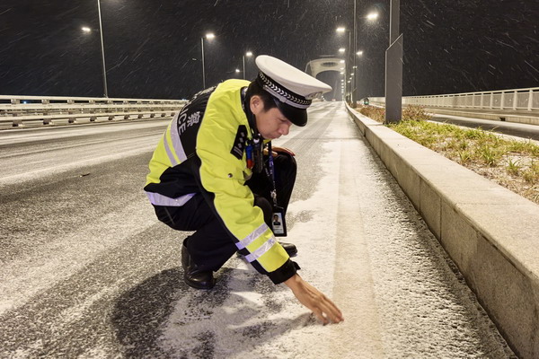 到桥面等易结冰重点路段检查路面结冰情况,及时发现隐患,提前预警处置,全力防范安全风险。