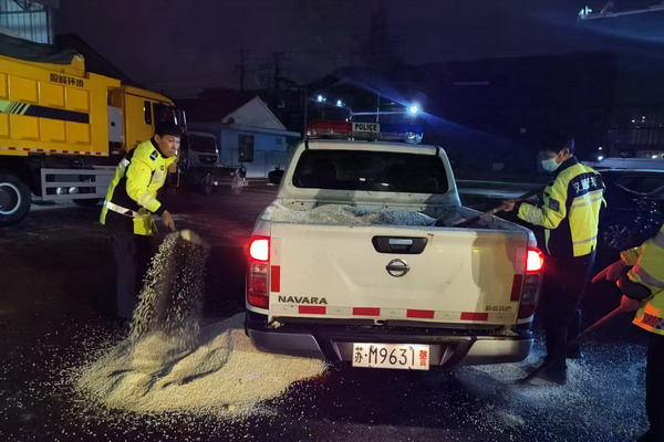 在警车上装载融雪剂,做好应急准备工作,确保一旦发生险情,物资随时调得动、用得上。
