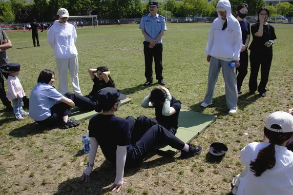 十指头后交叉,起身要求双肘关节碰触膝盖,下落要求双肩触及体操垫。