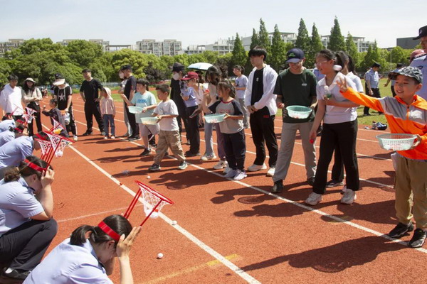 每个队伍2人(1名家长和1名小朋友)参加,家长头戴“头篮”,小朋友手持彩球,在规定区域内进行投掷。