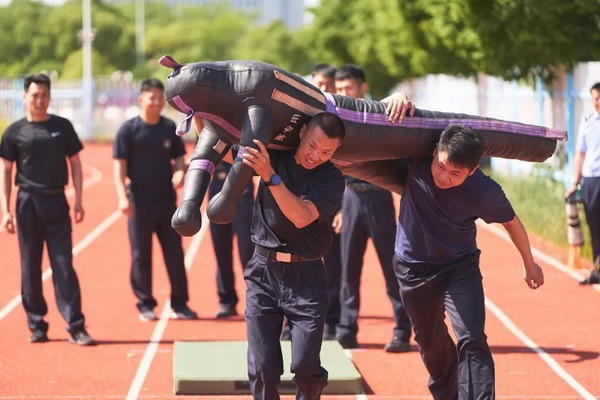 参赛队员2人一组,将60公斤假人从起点搬至终点,过程中要保持假人水平,禁止抛扔等动作。