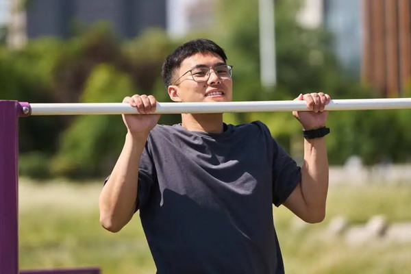 双手正握单杠,从静止状态开始比赛,上拉过程要求下颌超过单杠上沿,下放要求大小臂夹角大于九十度。