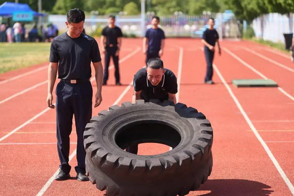 参赛队员2人一组,将一个50公斤轮胎,从起点翻至终点。过程中,两人配合,轮流将轮胎翻转180度,不得滚动轮胎。