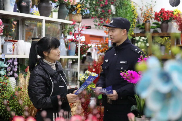【春节花店的预警花香】反诈宣传单藏进玫瑰束里,“别让骗子偷走你买花的钱”。预警的玫红与春意的粉光谱,安全提醒亦可芬芳。