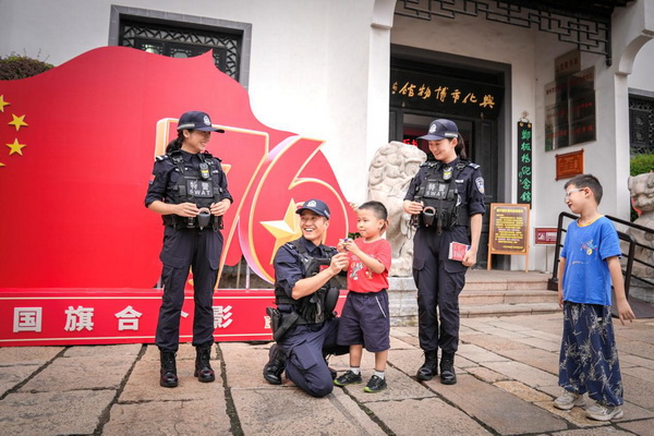 【国庆街角的致敬】小男孩突然立正举手,警察蹲身笑成对等的弧度。童真与责任在此互相致敬,此刻,守护有了最清澈的镜像。纯真靛蓝与庄重藏蓝交织的光谱,传承在敬礼间完成。
