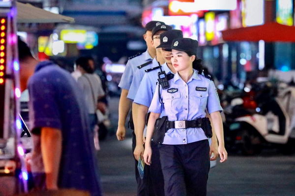 【夜市裙摆拂过的烟火】女警带队走过霓虹长街,喧闹在她身后渐次静好,仿佛她走过的地方,自动铺就安全毯。温暖的紫色光谱,柔化夜晚的棱角。