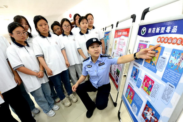 【展板前的平等视角】女警蹲身与少年视线齐平,新型毒品的伪装在阳光下显形。她不说远离深渊,只说:“罂粟再美,也美不过你十八岁的晴空。”纯净的七彩光谱,划出不可逾越的生命红线。