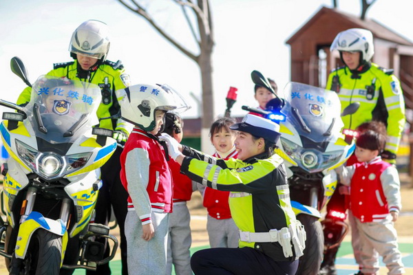 【头盔里的童话城堡】她蹲成与童年平视的高度,为男孩戴上绘有警徽的头盔。阳光穿过面罩,点亮男孩眼里的星星。铁骑的重型机车被孩子们好奇环绕,钢铁的冷峻与稚嫩的温热在此和解。柔粉色光谱,将冰冷规则包裹成糖,安全便从命令变成了童话。