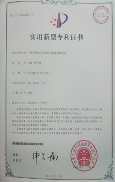 2018年1月9日,国家知识产权局为市局刑警支队叶波、李雪枫2名同志颁发了实用新型专利证书。二人结合日常理化检验工作实践,研究出鱼塘水中痕量农药富集辅助装置,用于大体积水样中农药的收集提取,大大缩短了样本提取时间,有效提高了检验检测率。