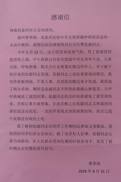 2019年8月31日,泰州实验中学支教新疆伊犁昭苏县高中教师曹荣海致信市局,感谢同样在昭苏支援的我局民警张毅在下班途中及时发现并抢救其生命的举动,赞扬张毅同志在昭苏工作期间心系当地群众,用实际行动彰显了新时期公安民警的责任担当。